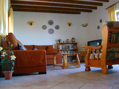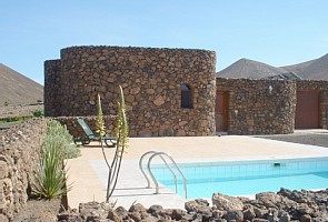 Visiting the villa is like taking a step back in time as it is built in traditional Canarian style but yet has all the modern conveniences. Part of its uniqueness is the fact that it is powered by solar & wind energy which allows the views to remain unspoilt by telegraph poles and pylons. Holidaying here you feel totally in tune with nature. On opening the door to the villa you enter an enclosed courtyard and colourful garden. The courtyard is terraced and the doors to the various rooms lead off the terrace. The villa boasts three generous sized bedrooms, two bathrooms, a fully fitted modern kitchen, a large lounge/dining area and a garage for all your surfing equipment. All rooms have rustic timber beams on the ceilings and the Master Bedroom is en-suite. The enclosed courtyard allows you to sunbathe in complete isolation and is the perfect place for children to play safely. The only sounds you will hear as you relax will be the clink clank of goat bells as they graze in the hills.
